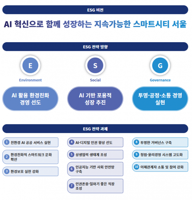 ESG 경영은 비전 체계의 주요 전략과제로 설정돼 기관 운영 전반에 전략적으로 적용되며, 서울시 AI 혁신을 선도할 기관으로서 윤리적 AI 거버넌스를 기반으로 환경적 책임과 사회적 가치 실현을 동시에 추진하게 된다.